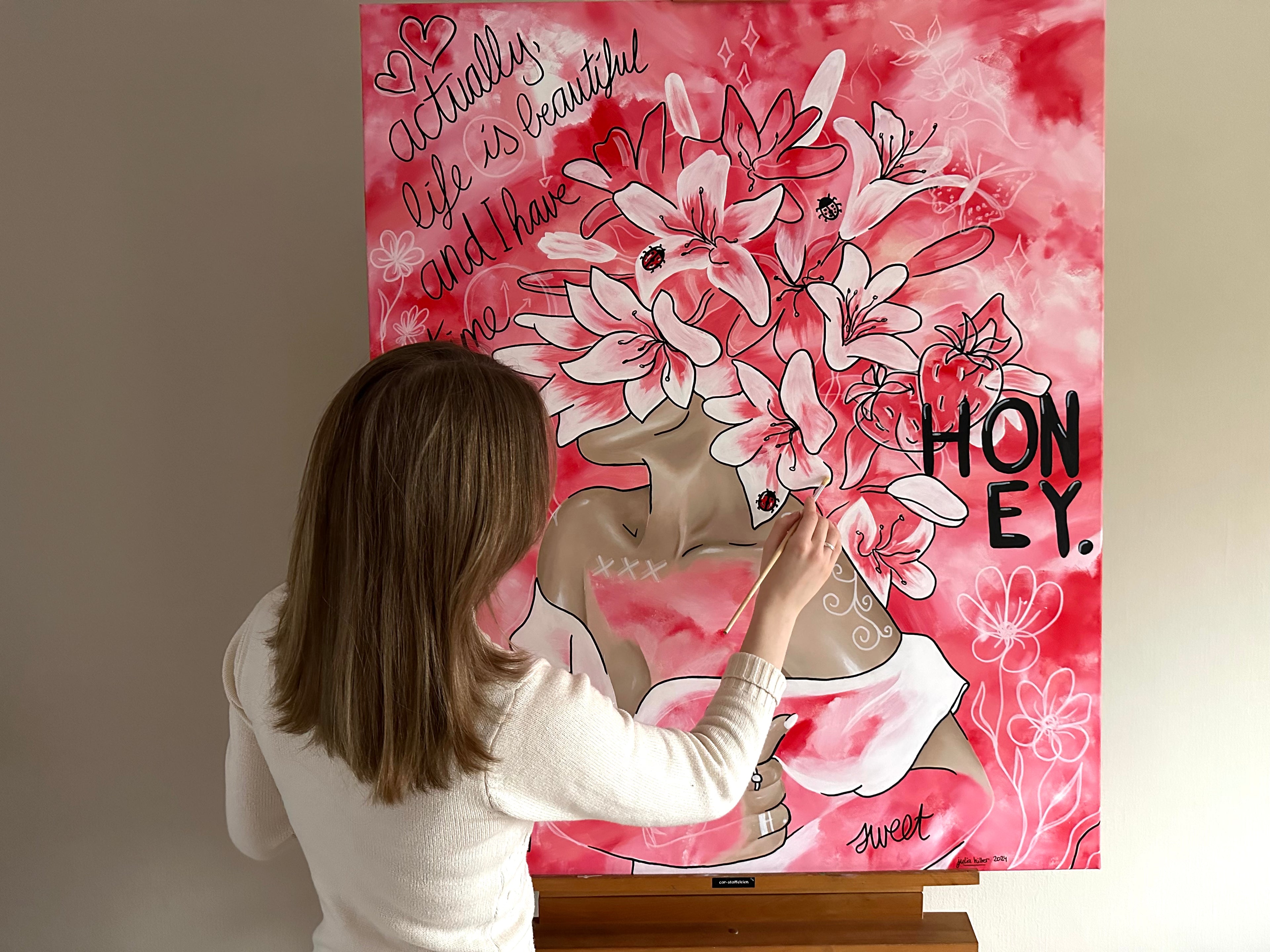 Im Jahr 2023 entdeckte die Künstlerin großformatige Werke und die Acrylmalerei für sich. In diesem Jahr entstand die Reihe "Flora", die sich mit den Gefühlen heranwachsender Frauen in der heutigen Gesellschaft auseinandersetzt. Ein Thema, das sich seitdem durch viele ihrer Werke zieht.